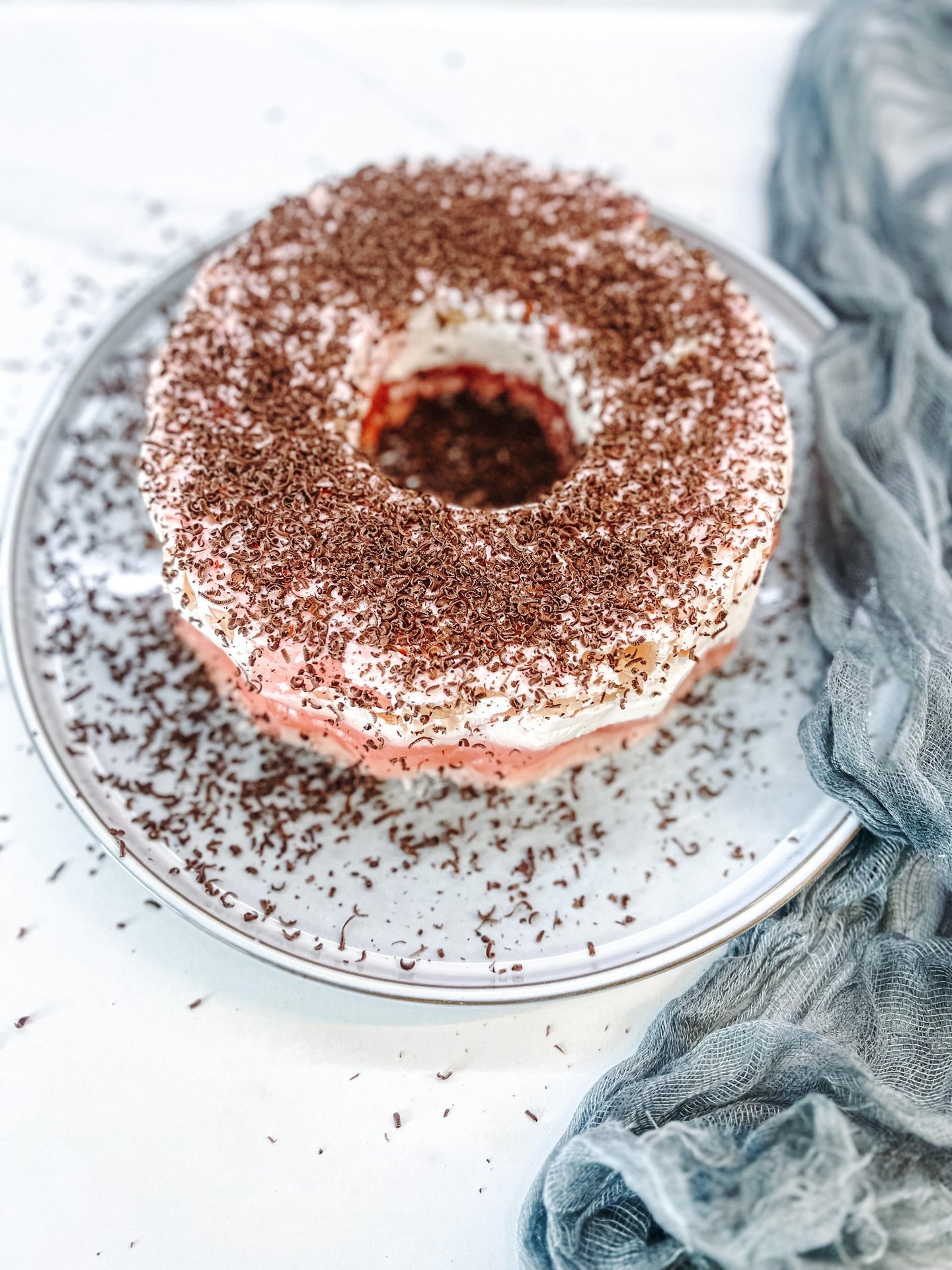 Kai masė sustings, pasiruošiame likusią pusę želė, palaukiame, kol atvės ir skystą supilame ant maskarponės masės. Paliekame per naktį.