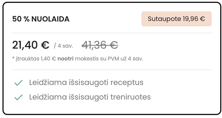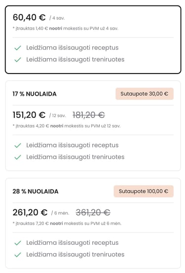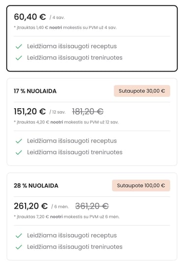 Arba pasirinkti tęstinę prenumeratą – tokiu atveju mokėjimas kartosis kas mėnesį tą pačią dieną, kol nenutrauksite prenumeratos.