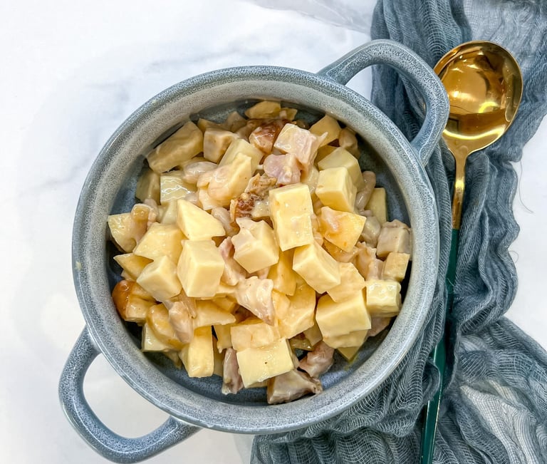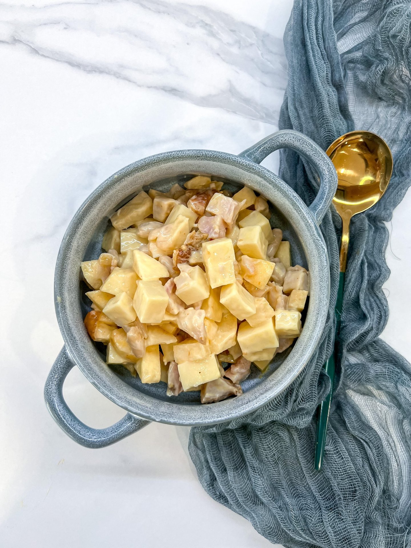 Vištieną nuimame nuo kaulo ir susmulkiname, sūrį ir obuolį pjaustome kubeliais. Viską kartu maišome su majonezu, padažu ir pupelėmis!